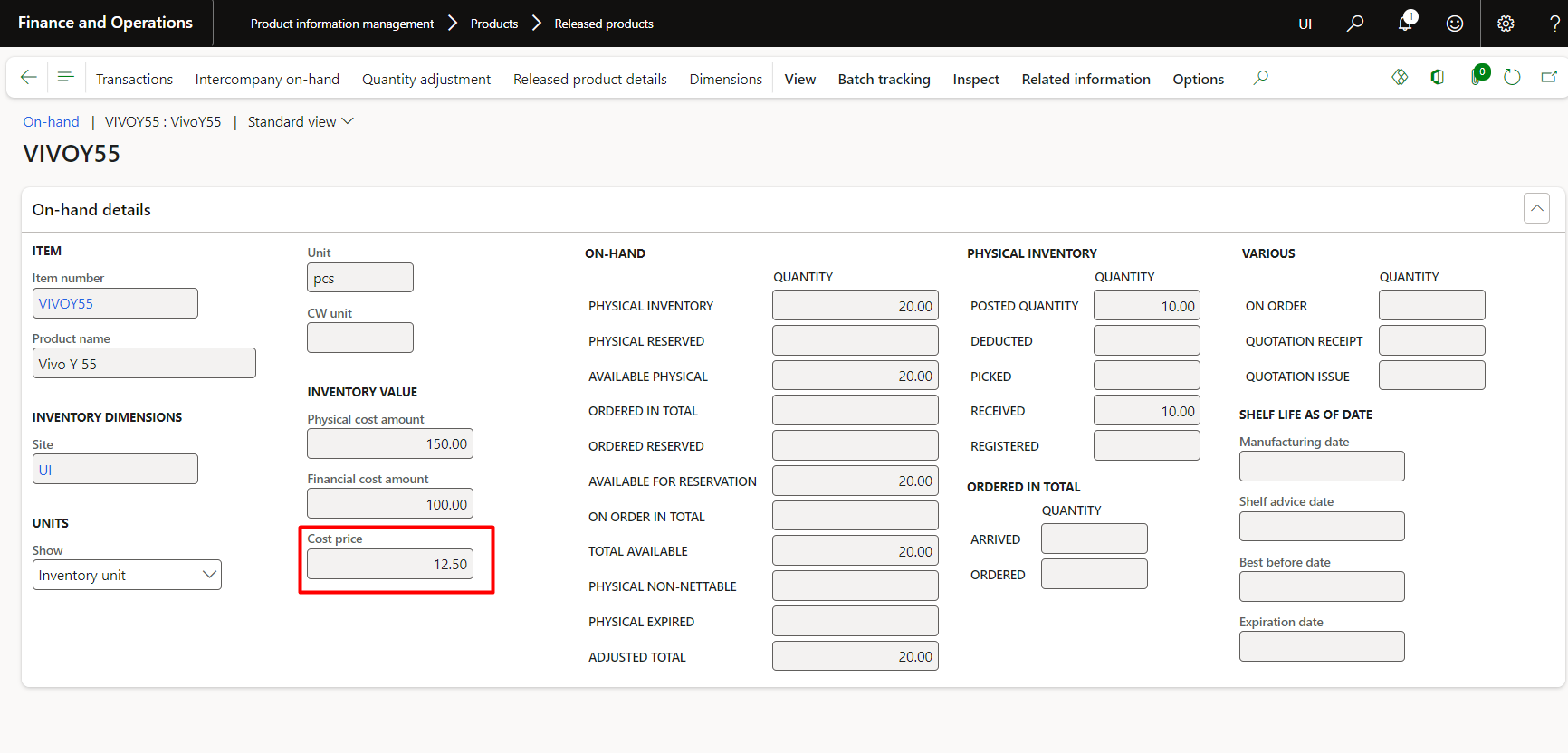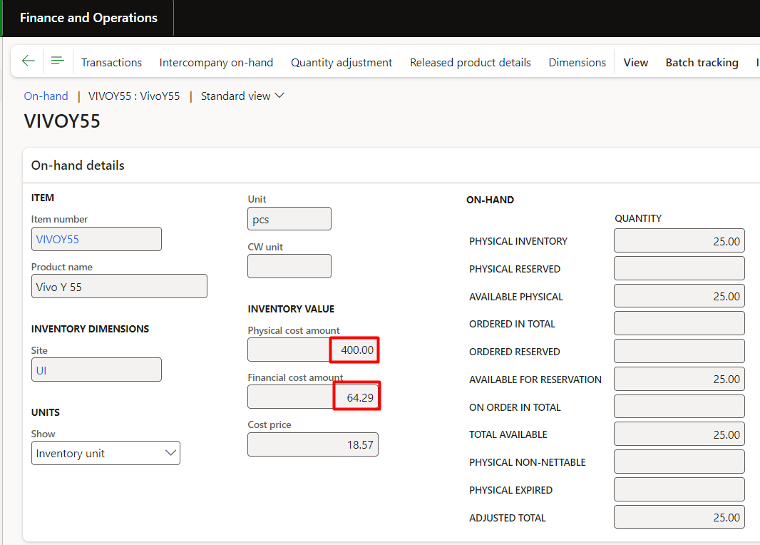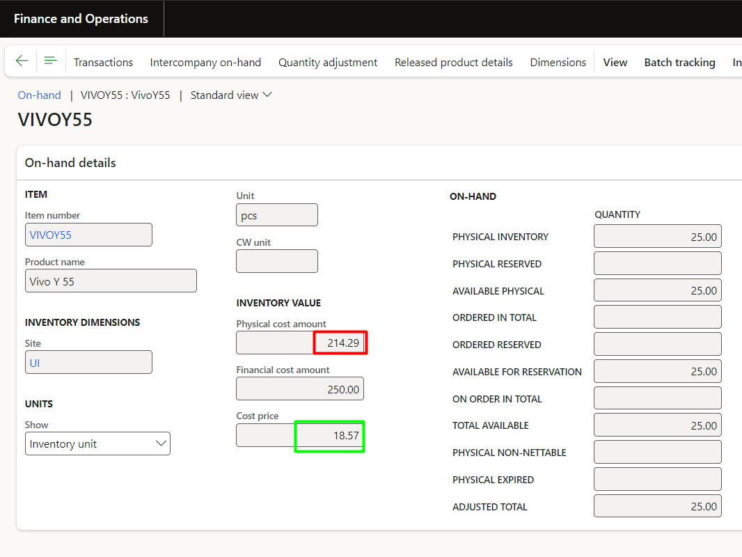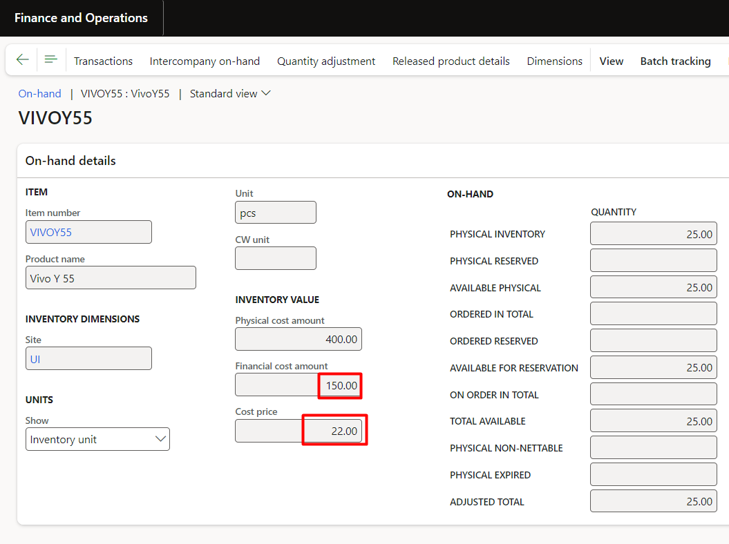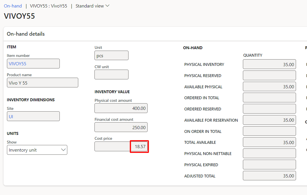 Therefore, showing the same value on item in D365: