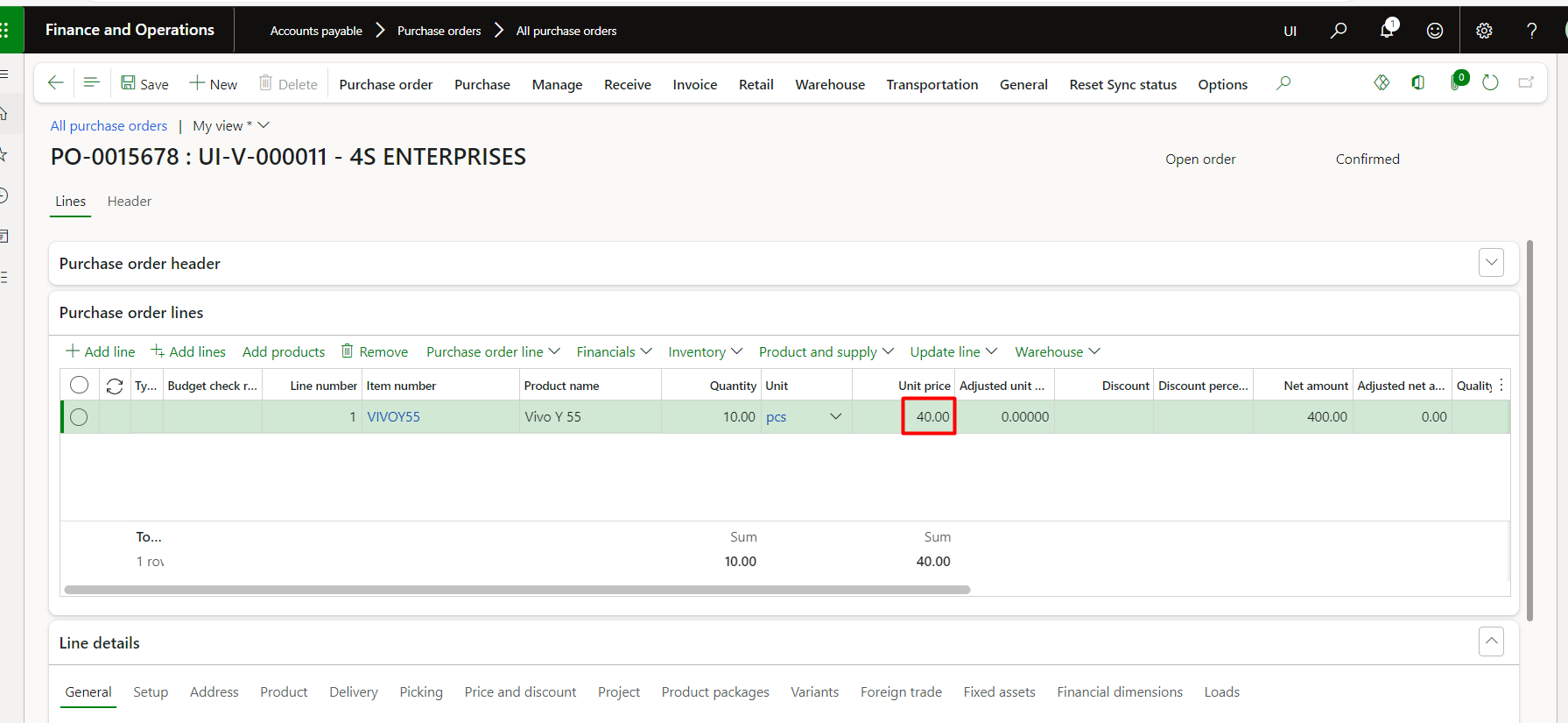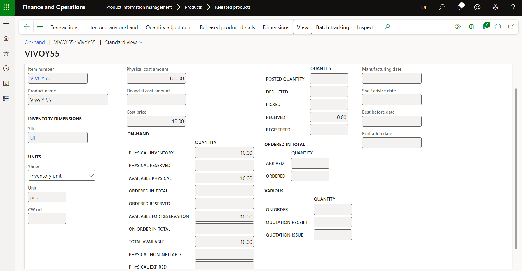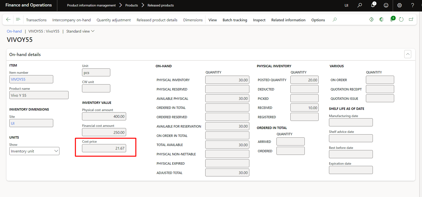 Therefore, showing the same value on item in D365: