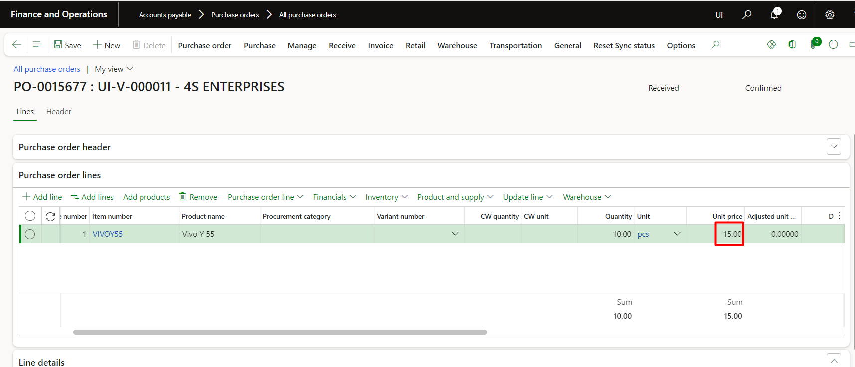 Product receipt posted, and the purchase order status is received. Cost price updated to $10.