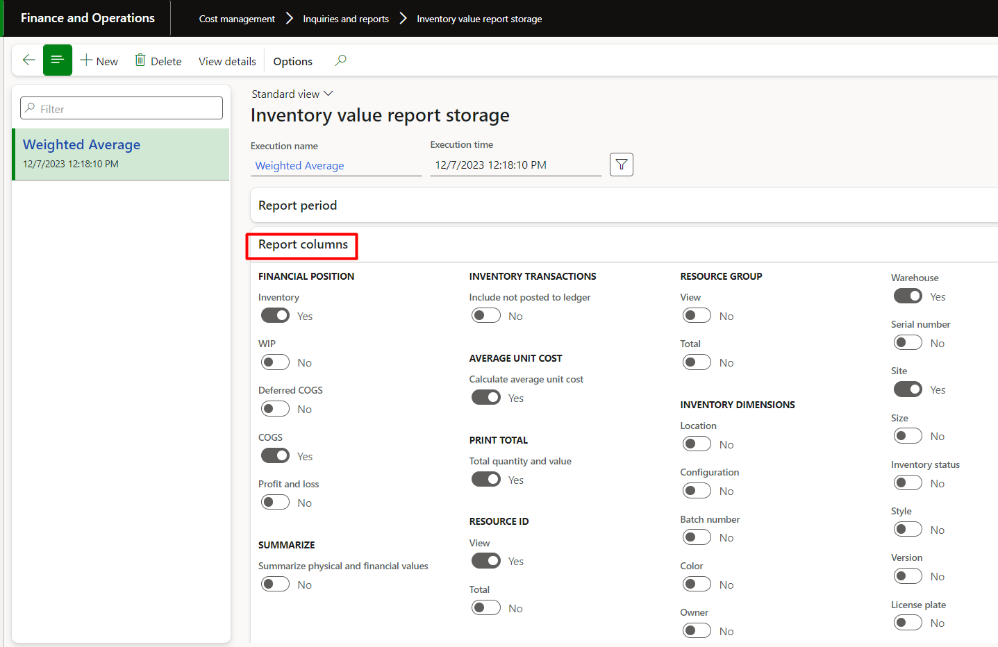 a) Inventory value report storage
