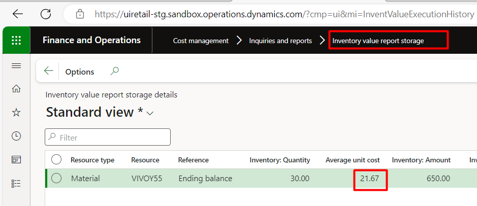 The Inventory Value Report by Storage again displays the same weighted average rate as shown in the item record: