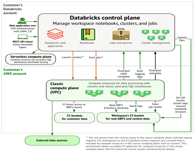 The control plane handles core services and workspace management. Databricks operates in its cloud account and stores things like notebook commands and workspace metadata, which are encrypted at rest for security.
