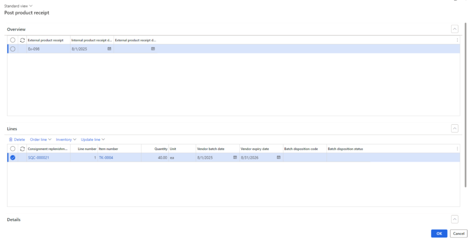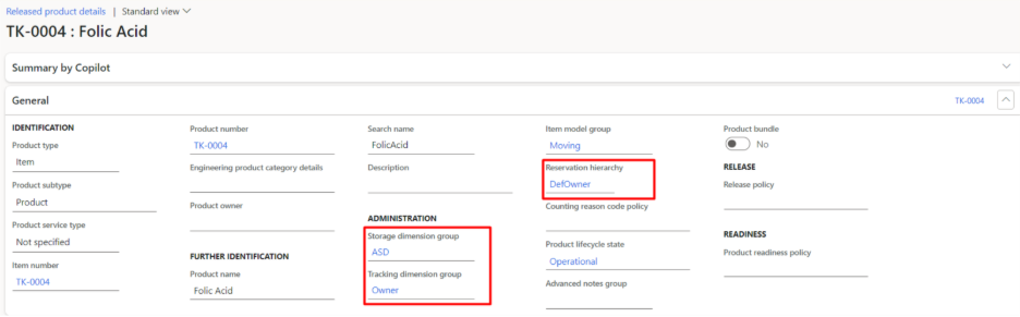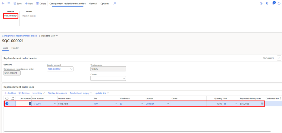Consider a real-world consignment inventory example involving Folic Acid (TK-0004), sourced from the vendor VitLife. In this scenario, the goods are initially received into a non-WMS warehouse to align with the standard consignment inventory process in Microsoft Dynamics 365.