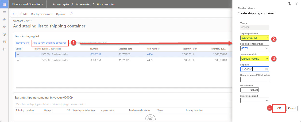 - Create a Voyage – open confirmed purchase order, create a Voyage, set the Journey template, and the shipping company