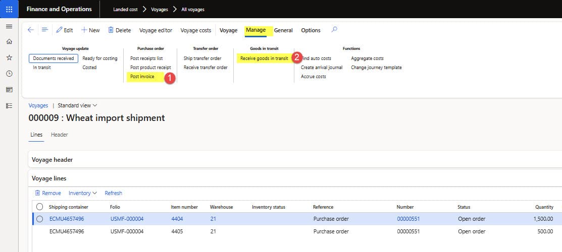 The Landed cost and goods-in-transit functionality in Dynamics 365 Finance & Operations provides a clear and controlled way to manage the financial impact of overseas shipments. By correctly applying GIT warehouses, voyage invoicing, under-delivery handling, and master planning integration, organizations can ensure that cost ownership aligns with shipping terms and that Landed cost is calculated accurately throughout the import process.