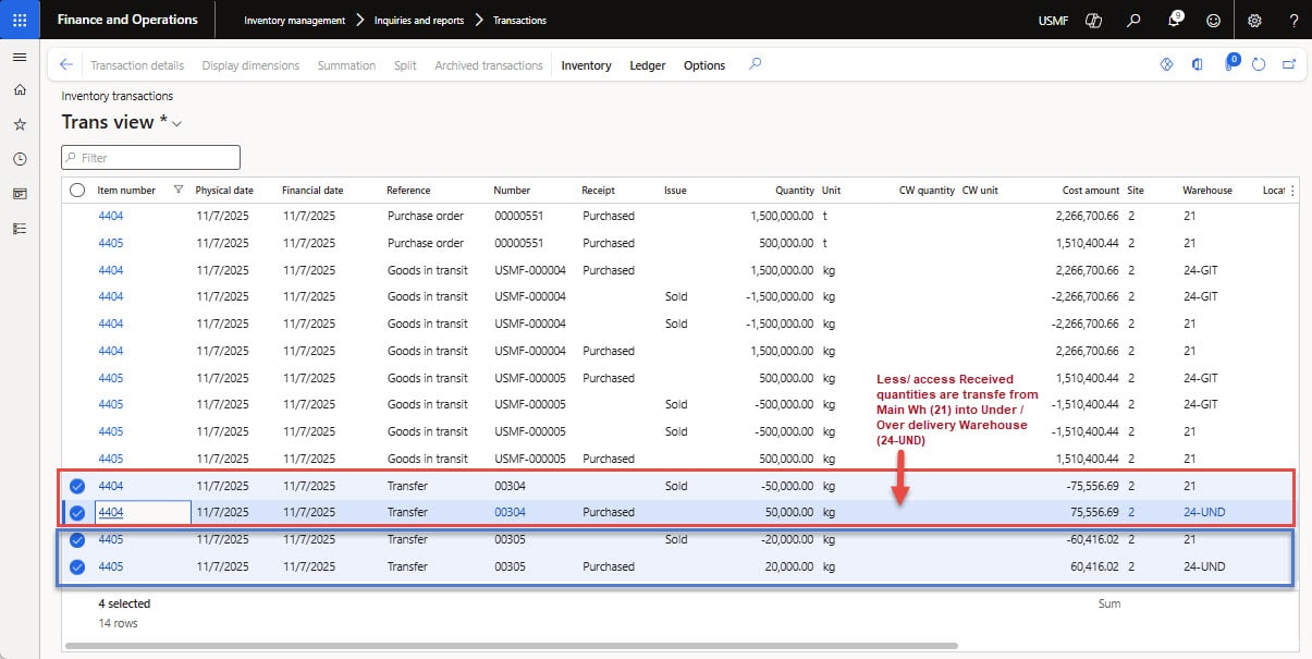 - Open the Transactions inquiry under “Inventory management ➜ Inquiries and reports ➜ Transactions”. You will also notice the “inventory transactions” which show receipt of goods in 21-Main Warehouse, and short/under-delivered quantity is received in 24-UND “under over delivery” warehouse, see Figure 19 below.