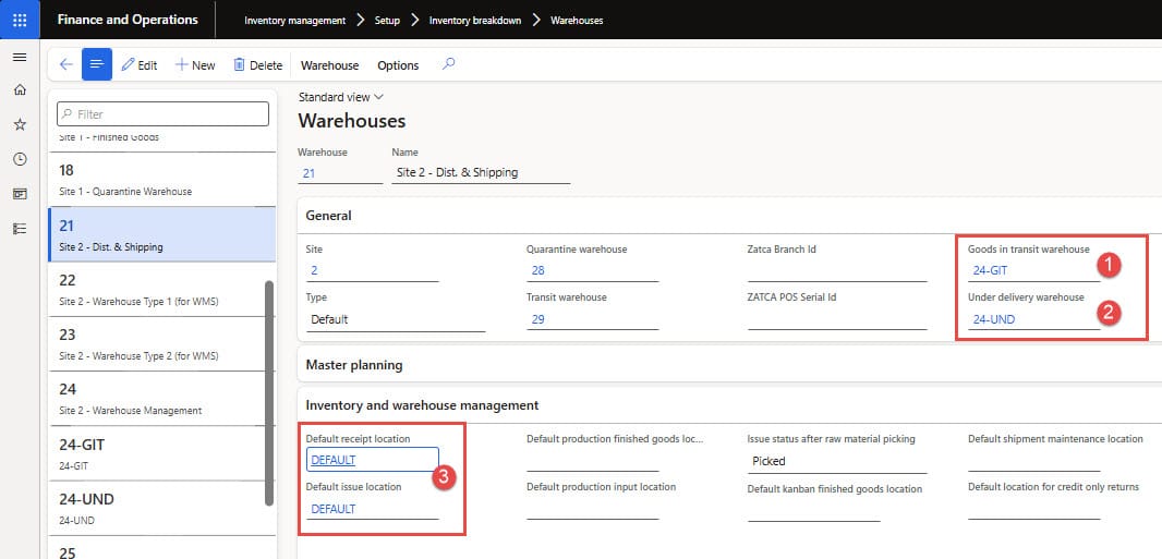 - Go to Inventory management ➜ Setup ➜ Inventory breakdown ➜ Warehouses page and set up Landed cost warehouses (1) Goods in transit (GIT) and (2) Under-delivery and set the “Default” receipt location field (see Figure X below). Successful processing of goods-in-transit orders requires both warehouses.