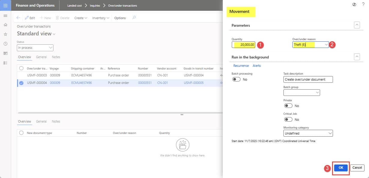- Go to Landed cost ➜ Inquiries ➜ Under over/transactions