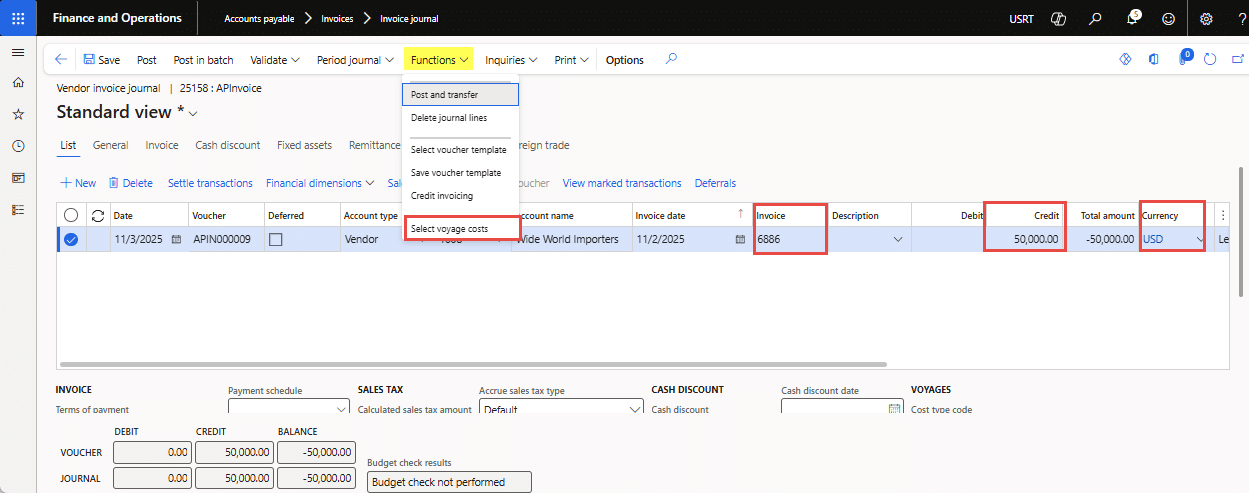 - Click OK to copy the selected “cost code types” lines and values into the voucher lines, and the invoice journal is ready for posting. The “Description” column in the voucher will reflect the Voyage number.