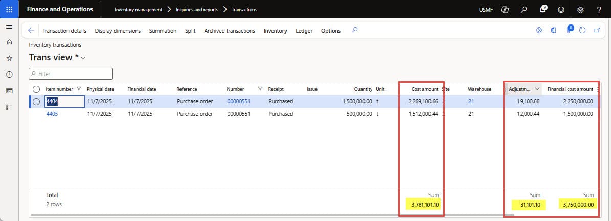 - Now navigate to Transactions inquiry under “Inventory management ➜ Inquiries and reports ➜ Transactions”, the inventory transactions will open. Filter the “number” column by purchase order#, and you will notice that the inventory “cost amount” is updated as per the items’ purchase costs and estimated Landed costs (see Figure 15 below).