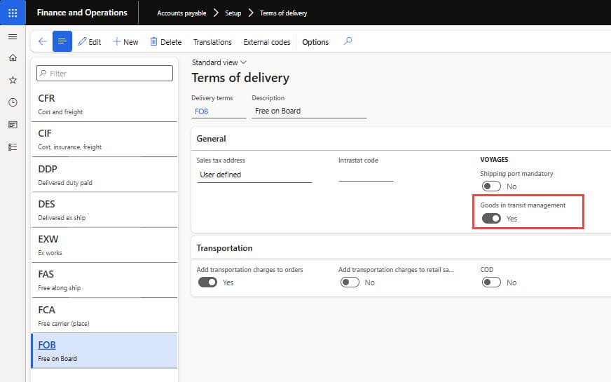 - Go to Accounts payable ➜ Setup ➜ Terms of delivery, identify the applicable term(s) of delivery used for goods-in-transit, and set “Goods in transit management” to “Yes” (see Figure X below). This feature puts the goods into the “goods-in-transit” warehouse when the purchase invoice is posted. This means users can no longer post a product receipt.