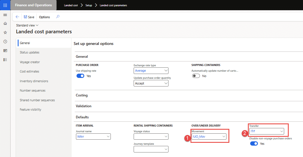 - Landed cost parameters: Next, set up the use of the newly created movement and transfer journal names under the over/under delivery options in Landed cost parameters, as shown in Figure 5 below.