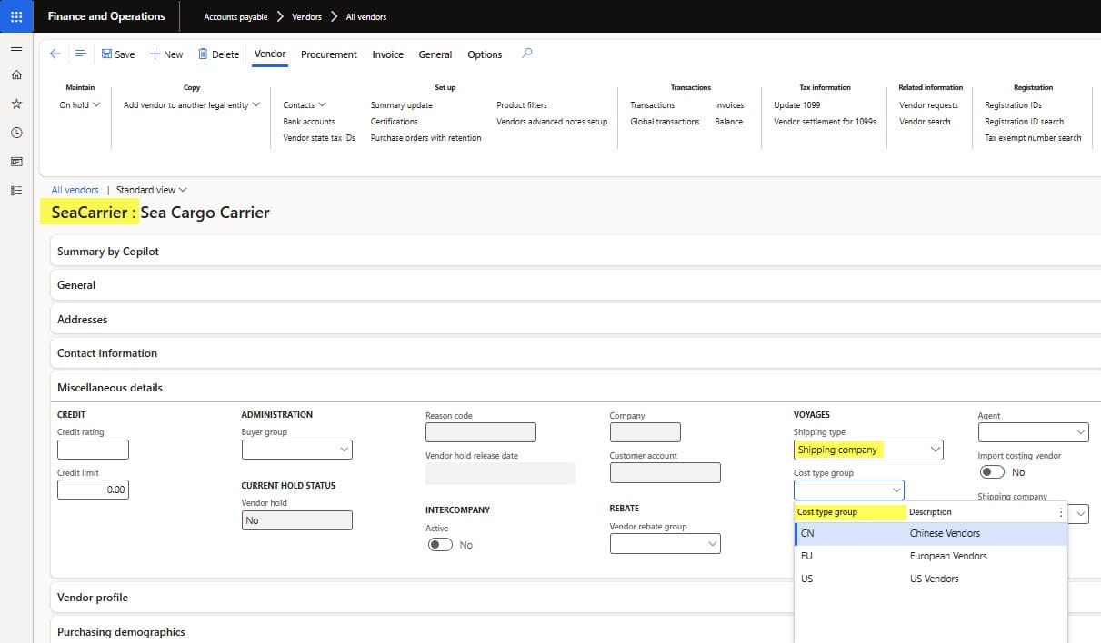 - Vendor master (auto cost group): Open the shipping company vendor master and set “EU” as the value of “Cost type group” under Voyage in the “Miscellaneous details” tab, as shown in Figure 6 below.