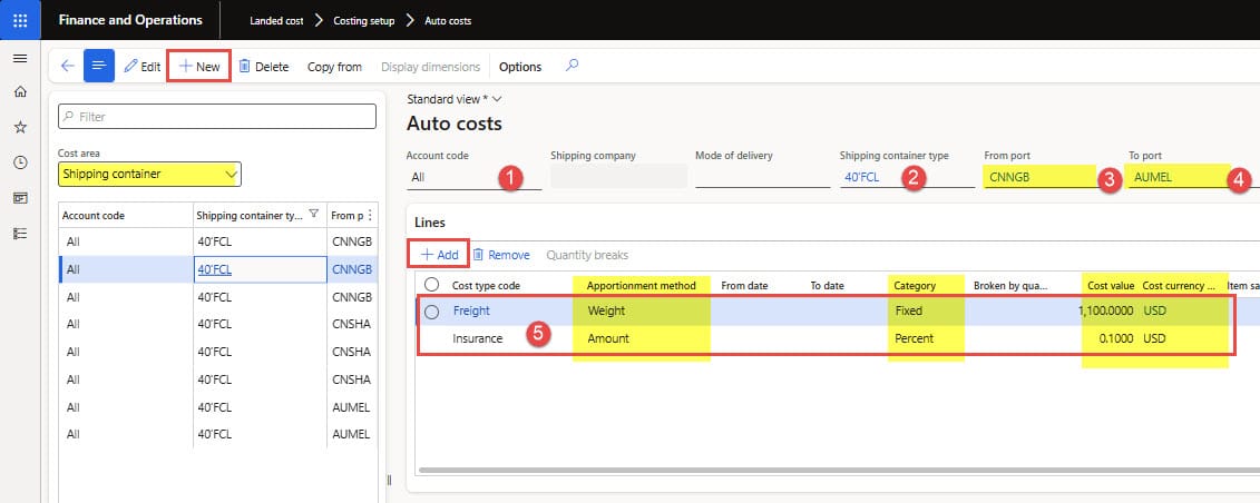 - Next, select “Shipping container” as a value in the cost area field and click the New button.
